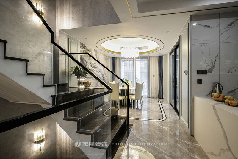 玻璃扶手簡(jiǎn)約時(shí)尚、壁燈增添氛圍感、抽象裝飾畫裝扮墻面,走到這兒仿佛走在藝術(shù)展館的樓梯間。