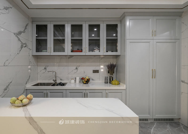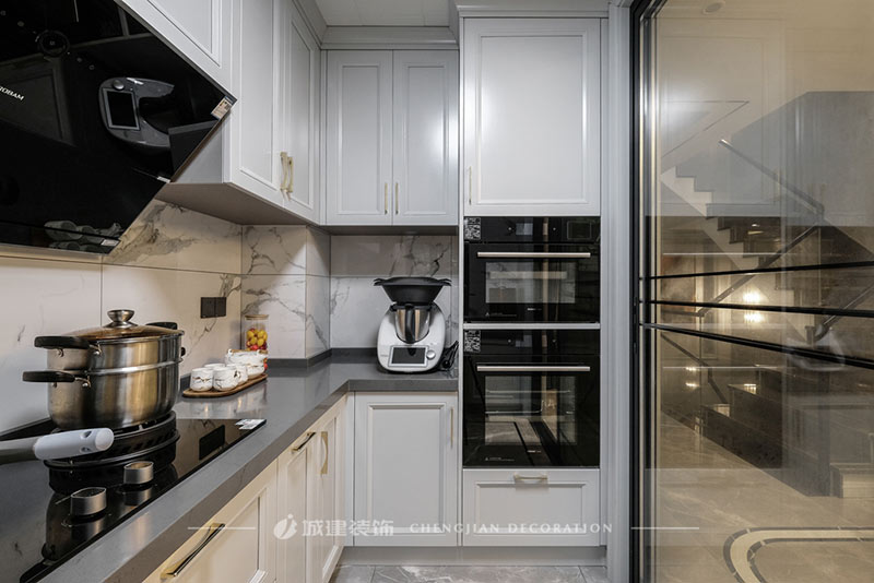穿過客廳,看到的是面對(duì)樓梯的開放式西廚區(qū),它緩解了大空間的視覺疲勞,營(yíng)造空間層次感;
