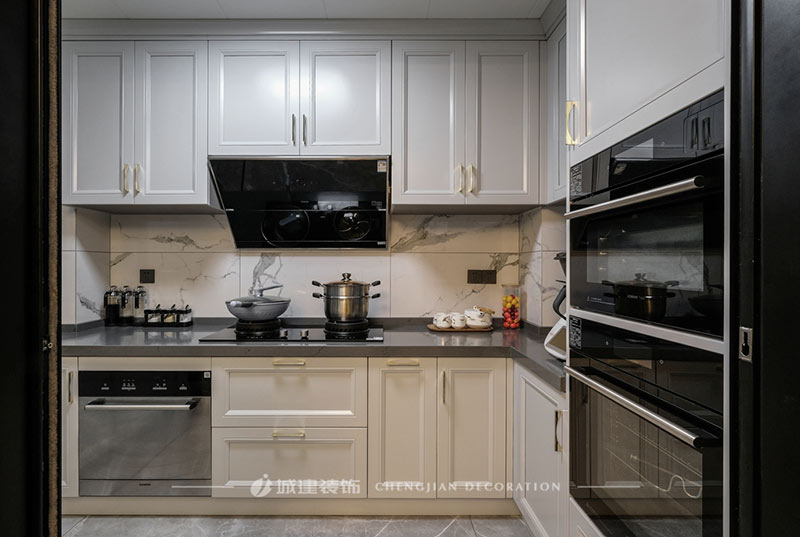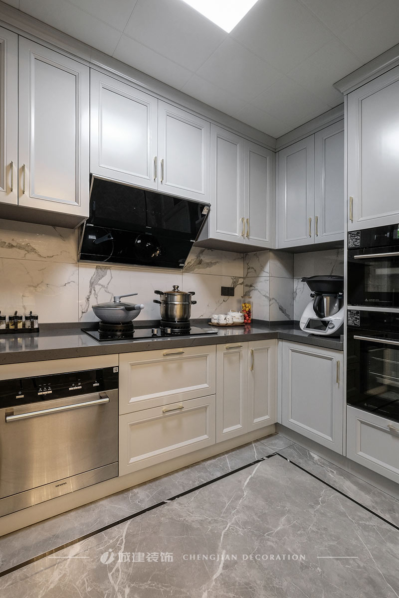 廚房較為狹窄,玻璃移門讓空間有延伸感,光線更充足;淺灰色櫥柜與整體風(fēng)格統(tǒng)一。