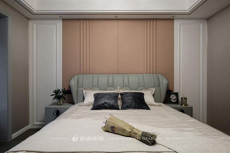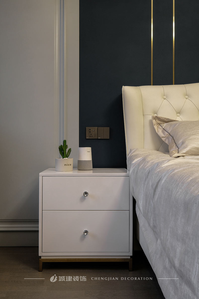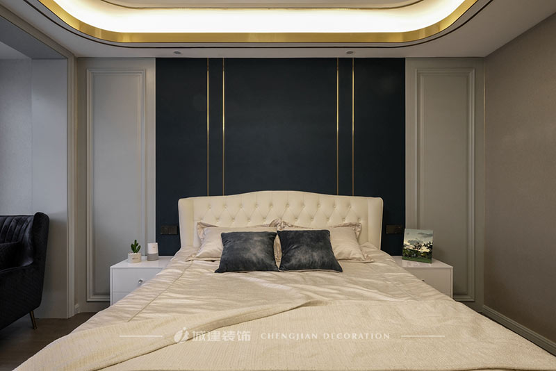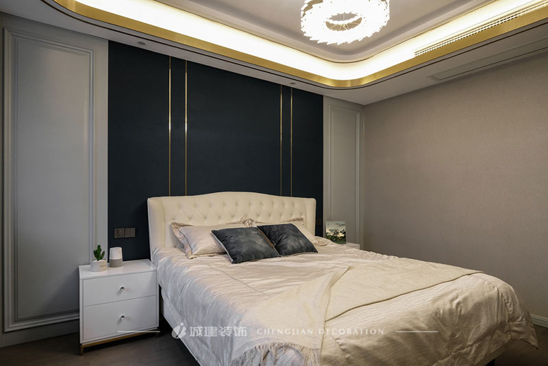 主臥,墨綠色背景鑲嵌金屬裝飾線條,圓角吊頂金屬裝飾走邊,內(nèi)嵌式燈槽搭配輕奢吊燈,整個(gè)空間雍容華貴、典雅靜謐。