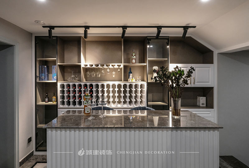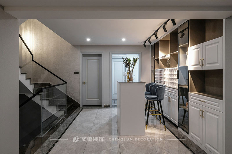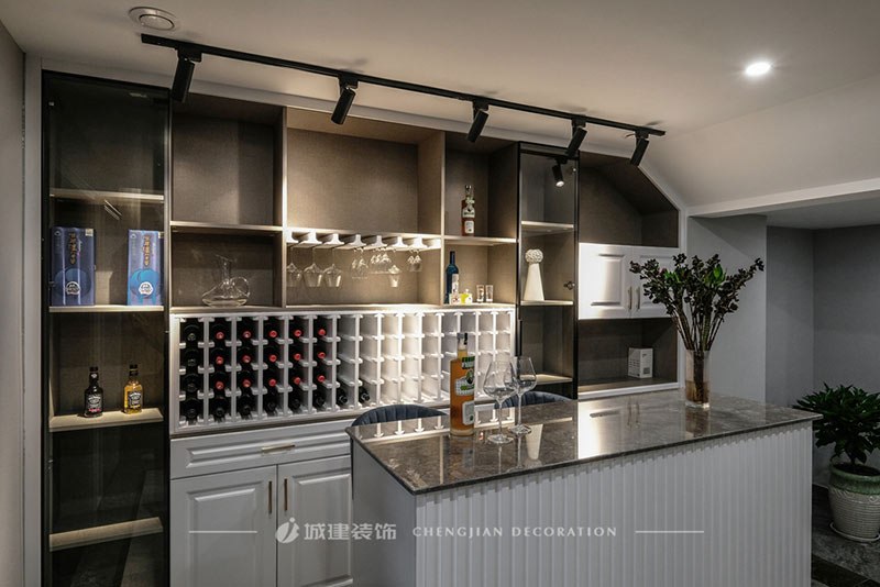 利用寬敞的樓道空間,打造休閑吧臺(tái):一面錯(cuò)落有序的酒柜,收納各類佳釀,閑時(shí)小酌兩杯,幸福~