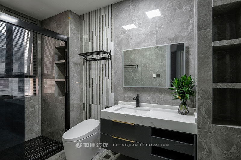 衛(wèi)生間依然延續(xù)灰色主基調(diào),空間黑灰白的經(jīng)典搭配簡(jiǎn)潔大氣,質(zhì)感滿滿。