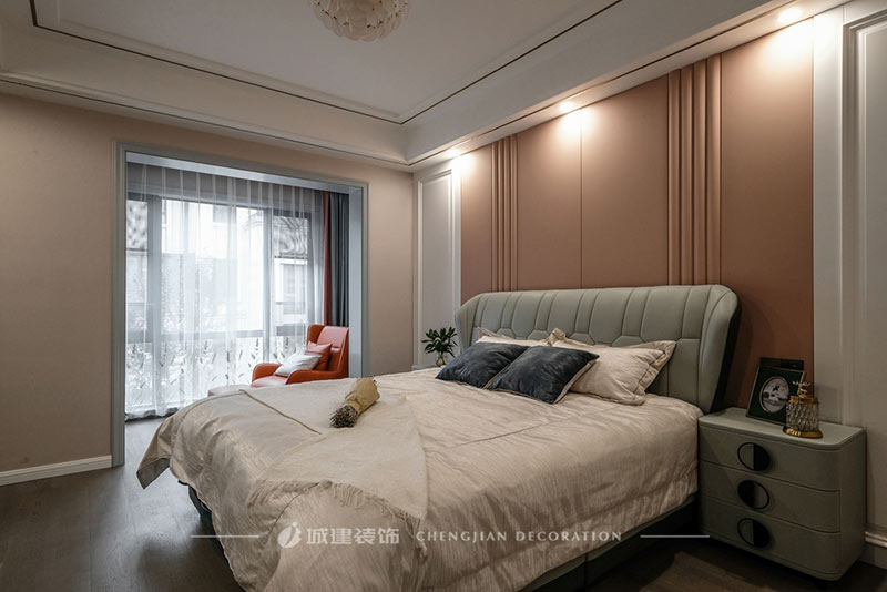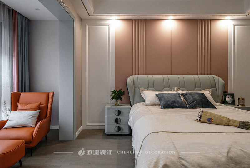 女兒房,選擇溫柔的粉色系,簡(jiǎn)潔的直角走邊吊頂用細(xì)金屬條裝飾,床頭射燈營(yíng)造溫馨氛圍,整個(gè)空間青春靚麗。