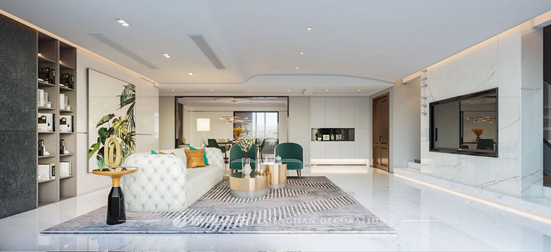 以白色為主基調(diào),質(zhì)感墨綠與金色元素恰到好處的點(diǎn)綴各個(gè)空間,彰顯摩登輕奢。