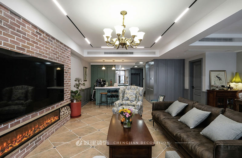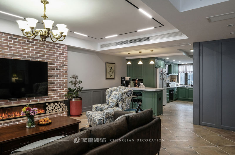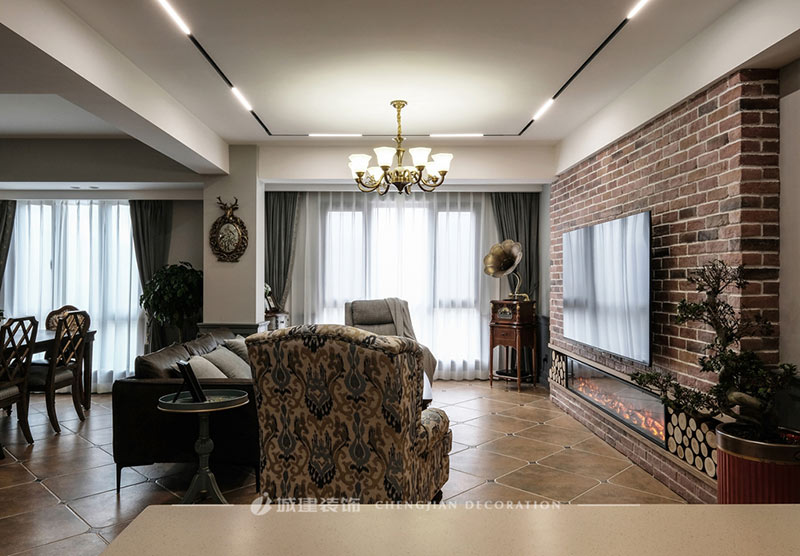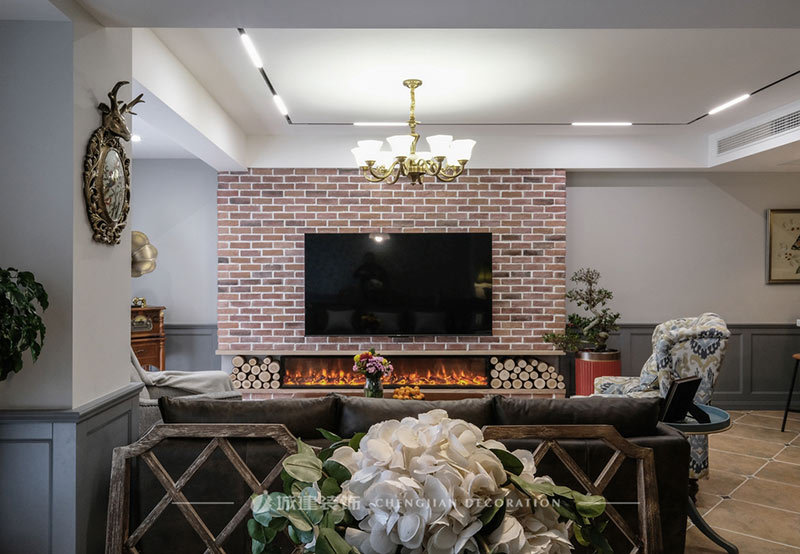 將紅磚搬進室內(nèi)打造背景墻,內(nèi)嵌仿真火焰的電子壁爐,堆砌著柴火,榕樹倚在一側(cè),