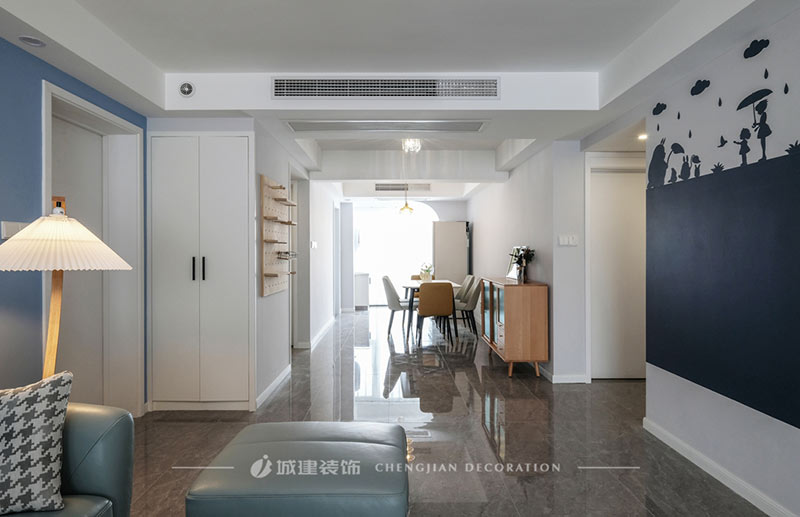 客廳以一抹天藍(lán)色為素雅的空間注入一絲晴朗,沒有放置茶幾,避免磕磕碰碰,也給予小朋友與大人充分的互動空間,