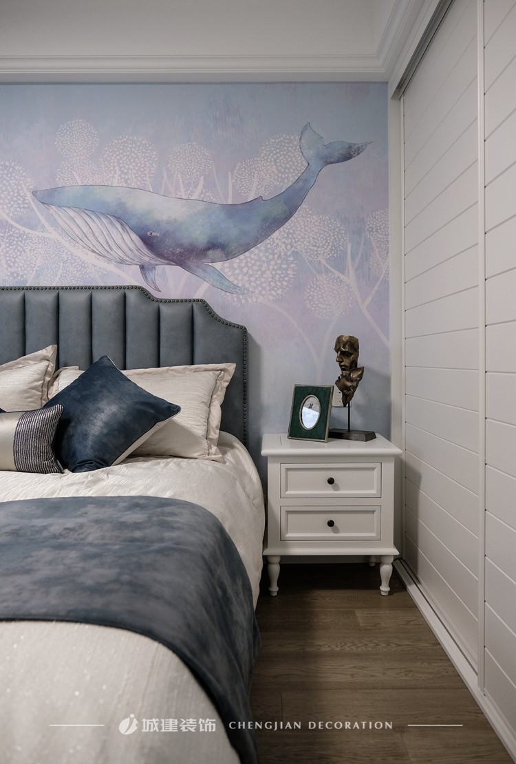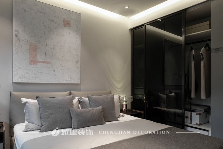 衣柜+電視:當(dāng)房間寬度局限,床尾過道寬裕的情況下,可以考慮這種做法,將電視機(jī)嵌入柜內(nèi),下方做成抽屜,兩側(cè)可以放置衣服,或一側(cè)設(shè)計(jì)成書桌,個(gè)性化定制,美觀又實(shí)用。