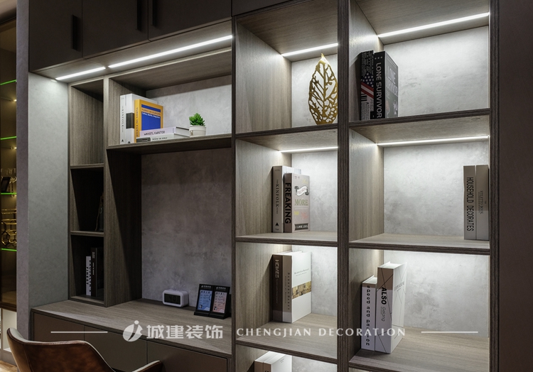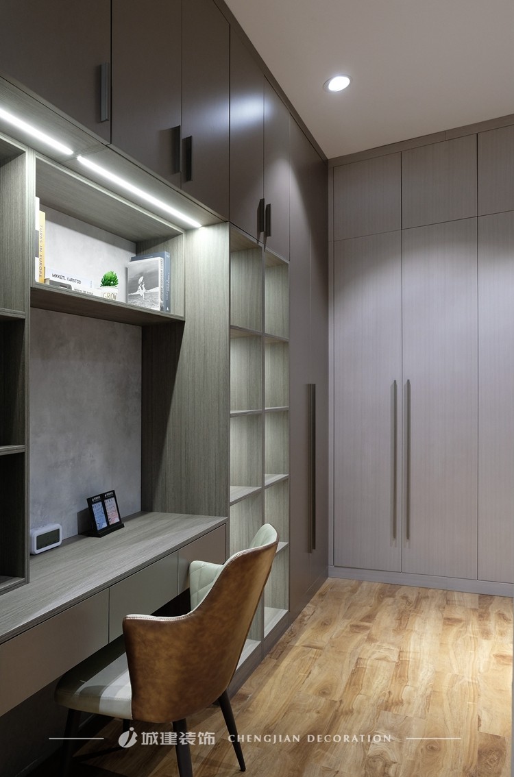 衣柜+書柜書桌:衣柜、書桌一體化設(shè)計(jì),與書柜相襯,整體空間布局合理緊湊,100%利用空間,輕松就能打造出一個(gè)小書房。
