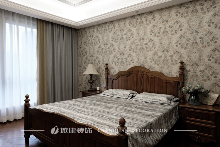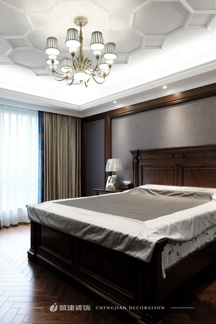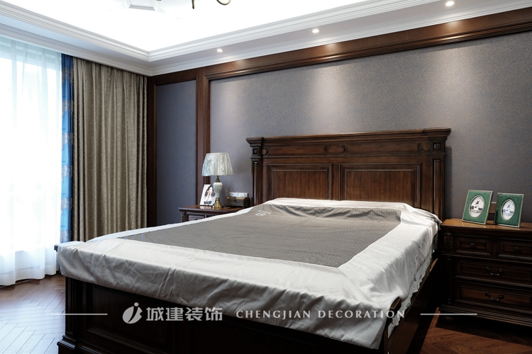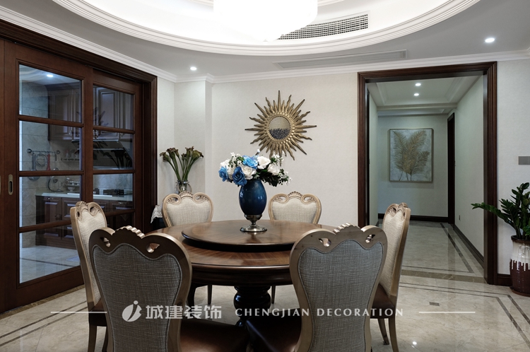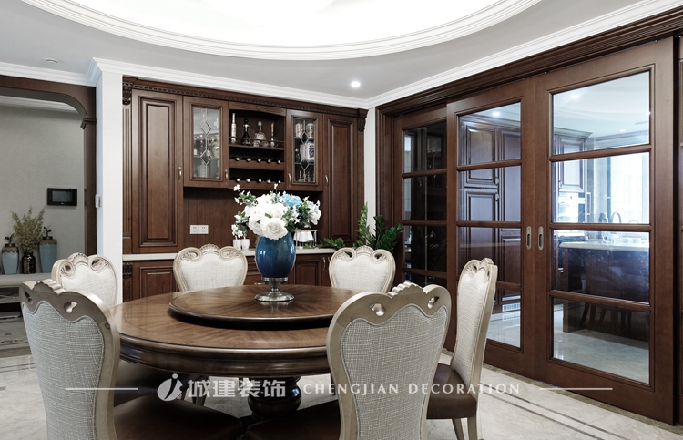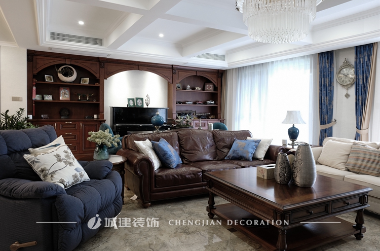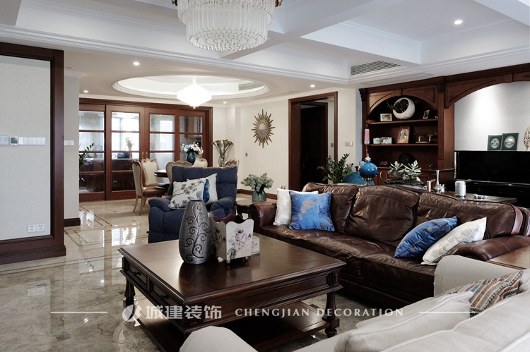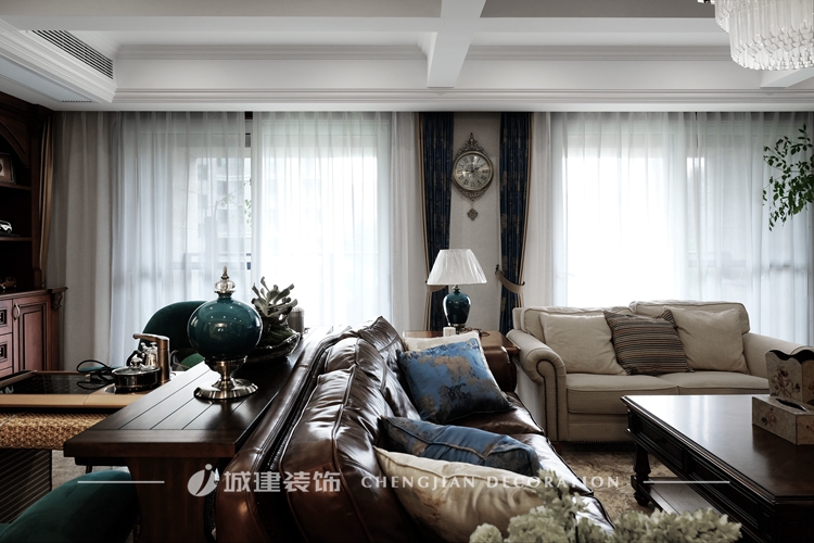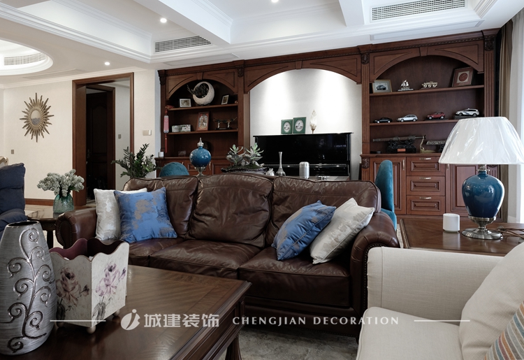 本案設(shè)計(jì)前,屋主已將部分家具選好,這也讓設(shè)計(jì)師確定了風(fēng)格走向——經(jīng)典美式。整體定調(diào)為沉穩(wěn)的深色系,大面積的白色反差搭配,混搭皮革、實(shí)木及布藝家具,讓每個細(xì)節(jié)都精細(xì)雅致,既奢華又文化氣息濃厚,猶如置身一部經(jīng)典的美劇之中。