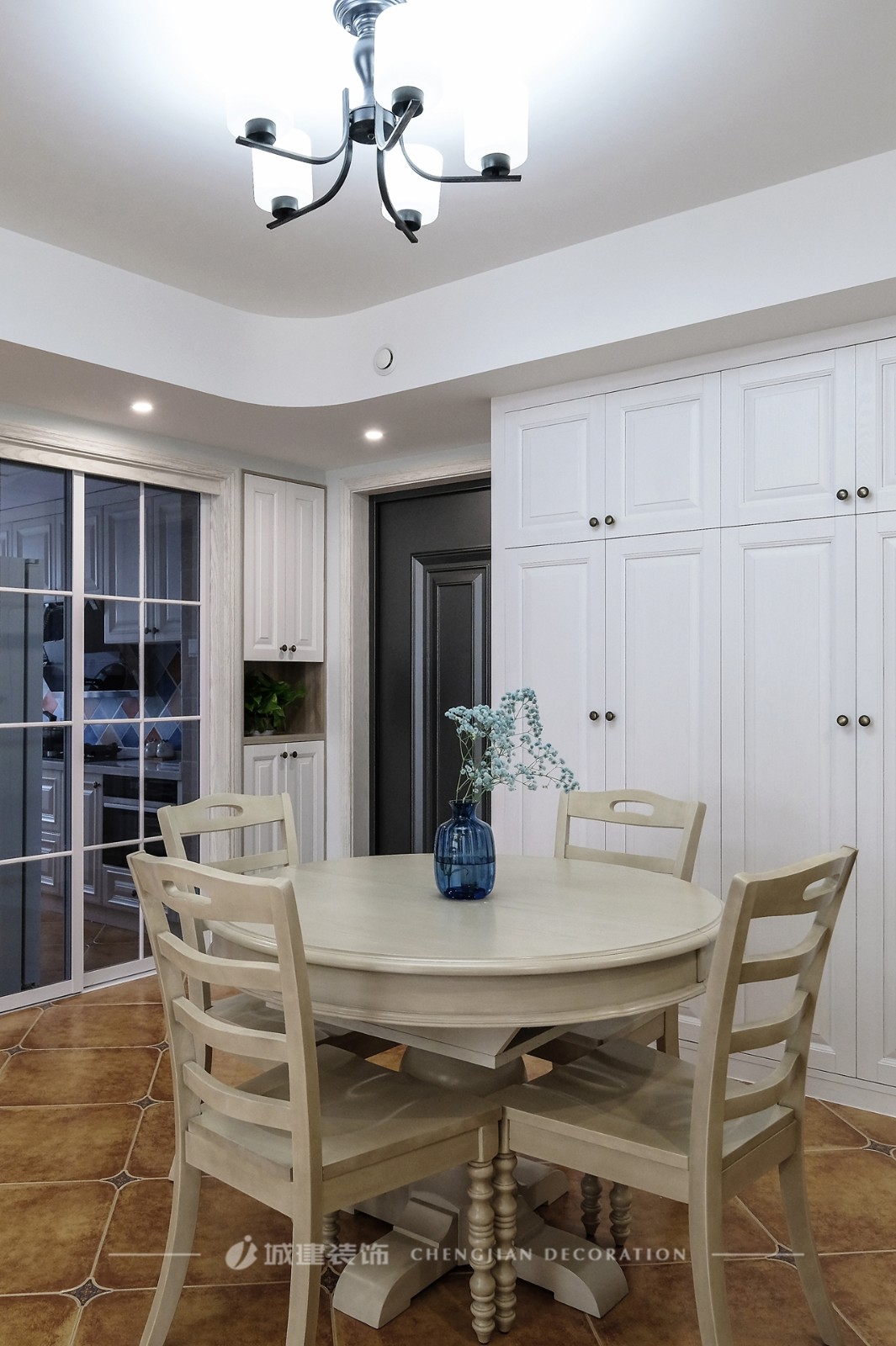 【客餐廳】保留原有的整體大空間,淺灰藍(lán)色的墻面營造溫婉舒心的環(huán)境;仿古磚與復(fù)古美式家具傳遞出歲月留聲的怡然自得。