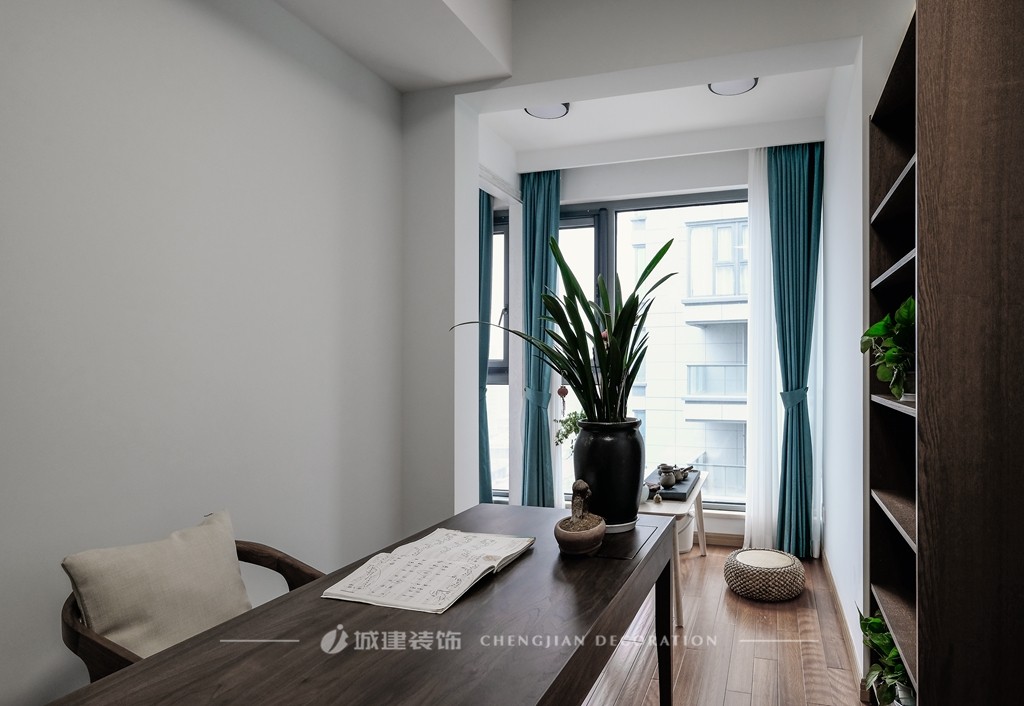 【書房】兩個字:靜心。純白色墻面搭配黑胡桃色書桌書柜,極簡舒心;窗邊席蒲團(tuán)而坐,品一壺好茶,身心愜意。