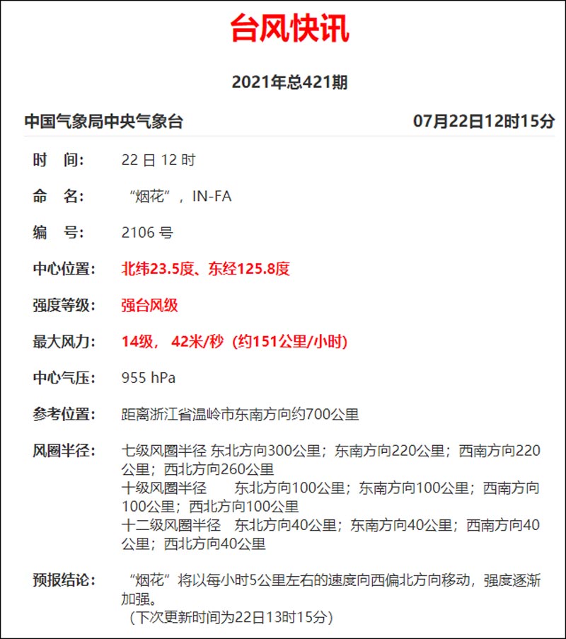 “煙花”將于23日中午前后移入東海東南部海域,強度逐漸加強,最強可達超強臺風級(16級,52~55米/秒),
