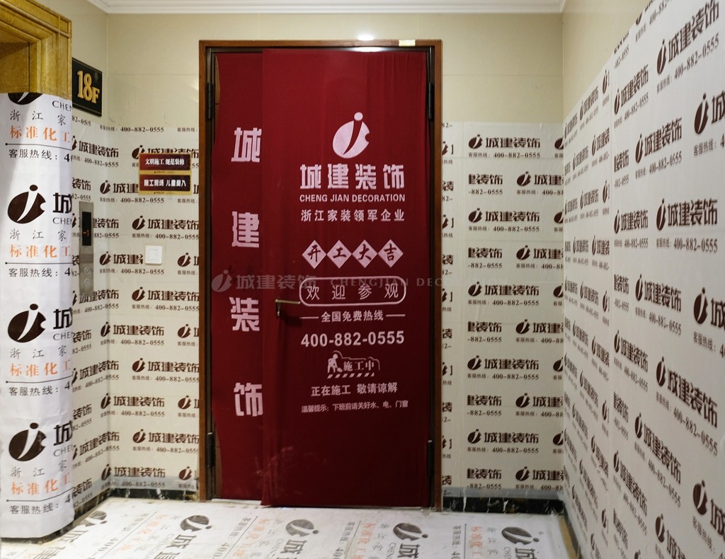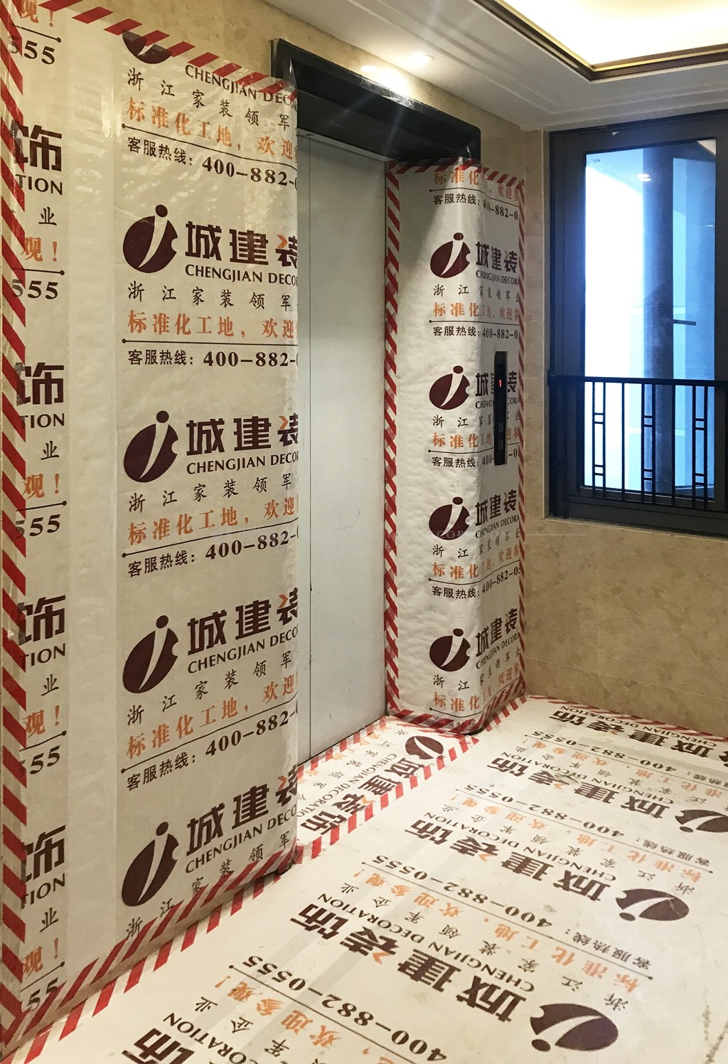 入戶門、電梯口、窗戶、陽臺等均使用城建裝飾專用門套、保護(hù)膜保護(hù);
