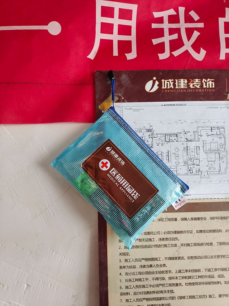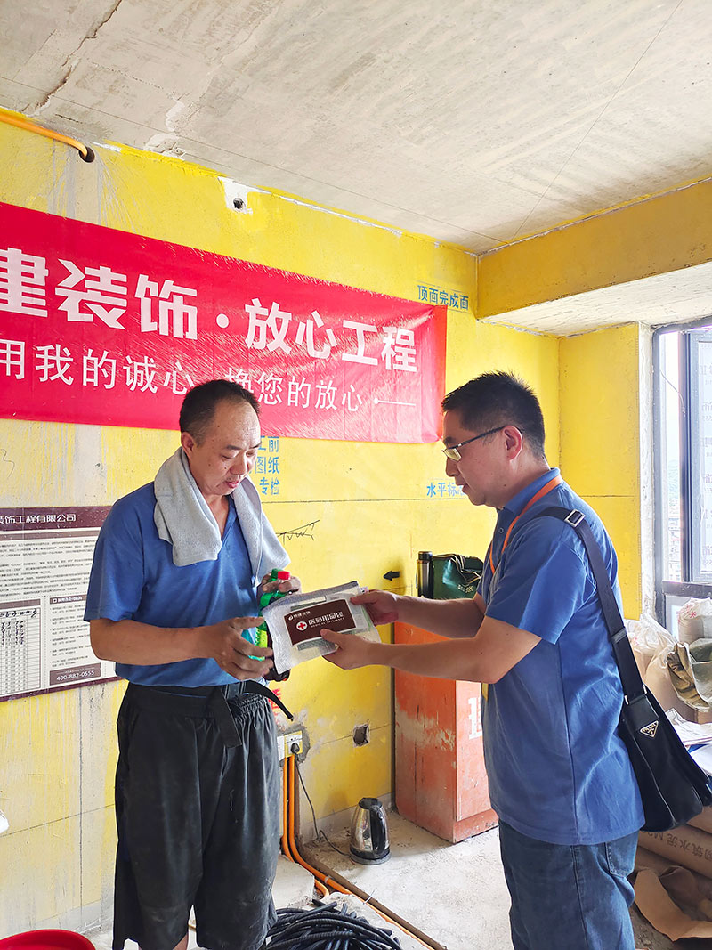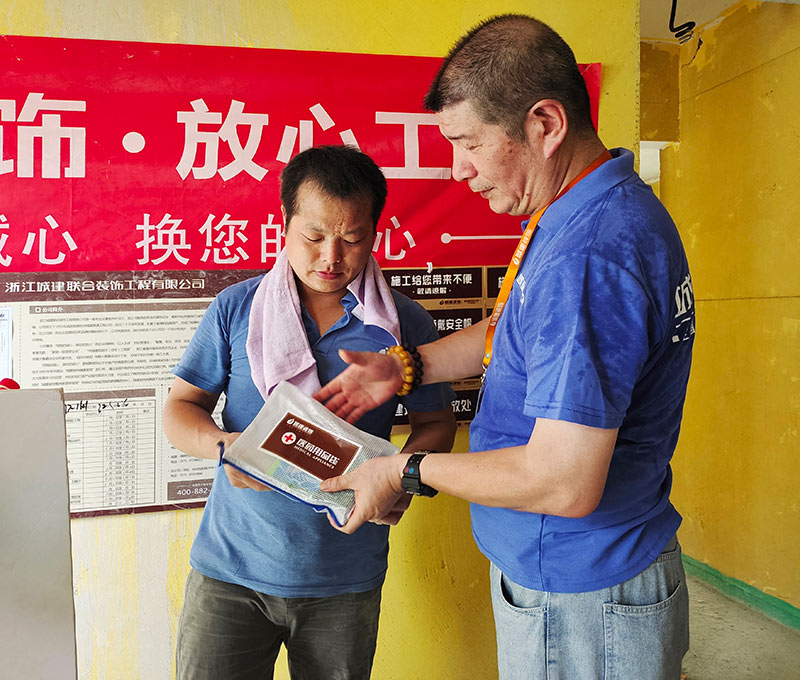 為工人師傅們送去解渴的飲料和毛巾,給每個(gè)工地配備上<醫(yī)用藥品袋>,