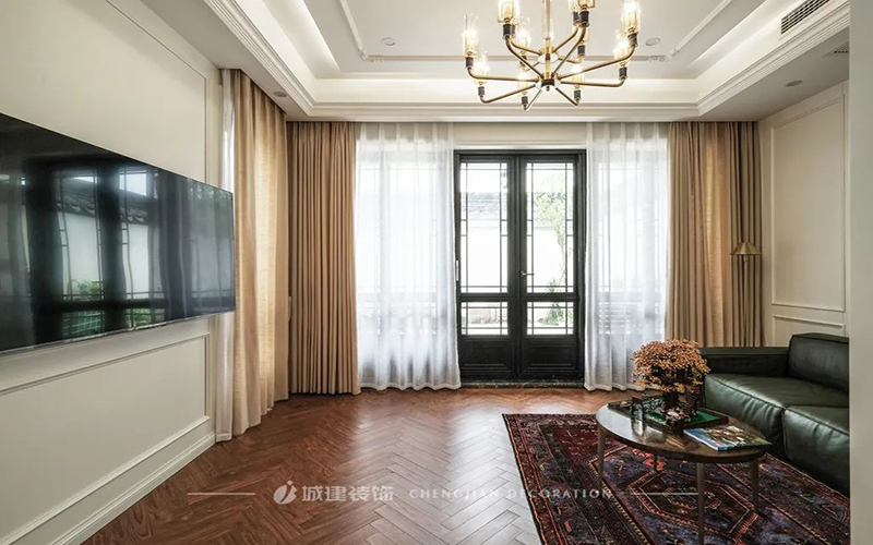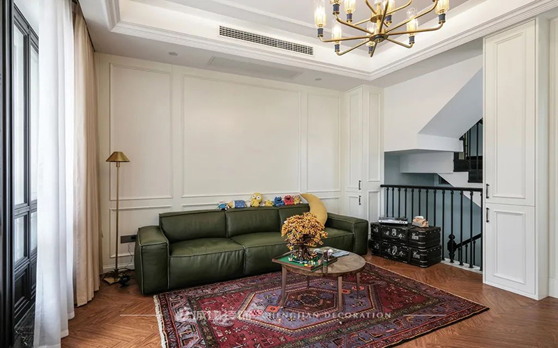 乳白色護墻板,人字形鋪貼木地板,簡潔的線條描繪出優(yōu)雅的視覺感,簡約而自然;復古墨綠色沙發(fā),精致華麗的地毯,復古的手