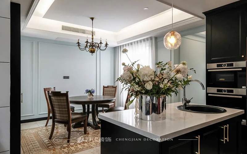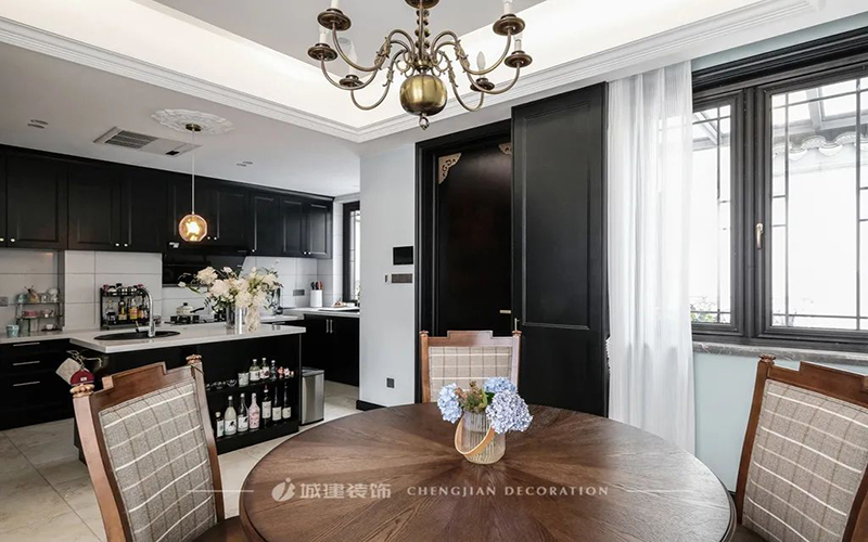 餐廳選擇復古地磚,異域風情的拼花磚,豐富空間層次;胡桃色美式餐桌椅,格子花紋的布藝靠背,溫馨復古;造型精美的美式銅吊燈,