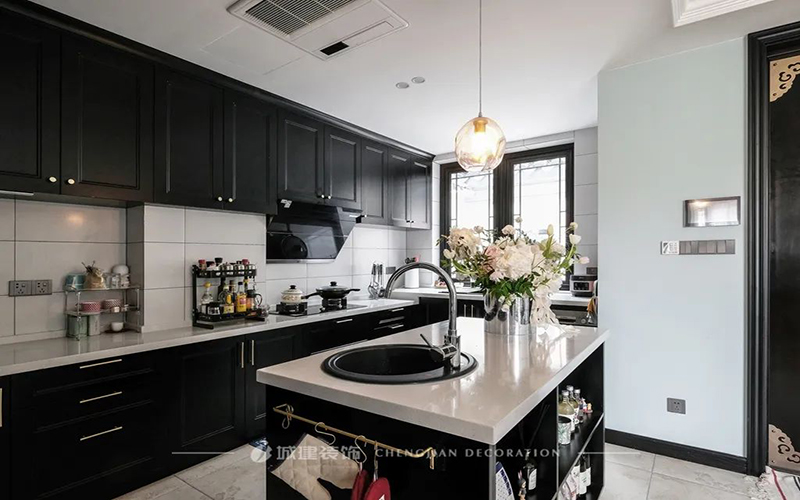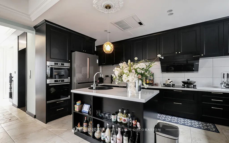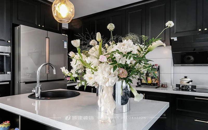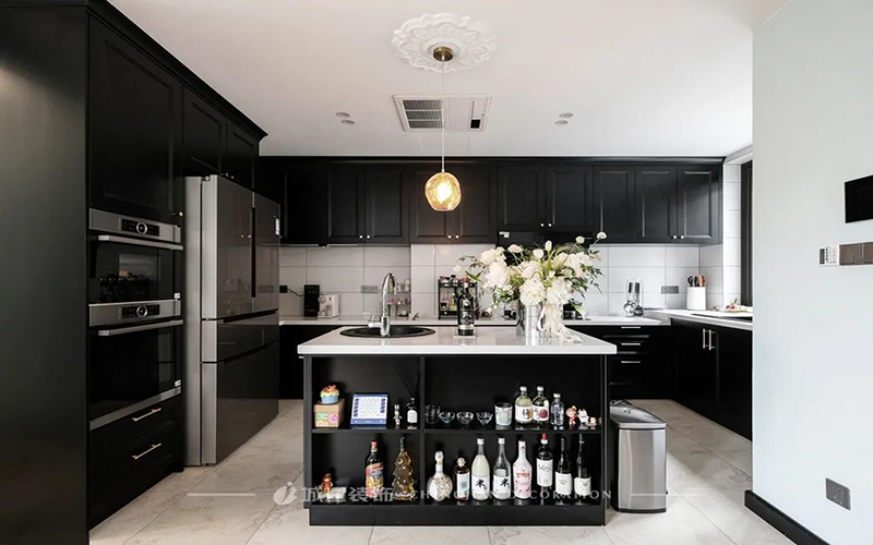 設計師又大膽地運用了黑色,配以極致對比的白色臺面和墻面,簡潔利落,再搭配金色拉手,腔調十足。