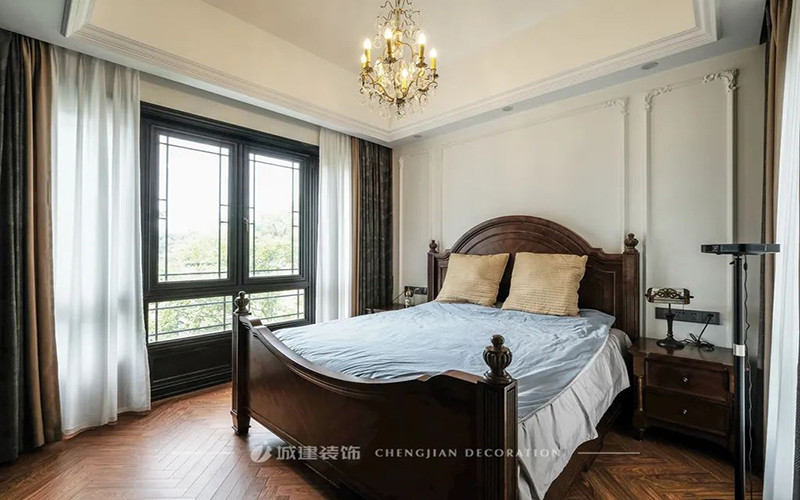 主臥延續(xù)簡約沉穩(wěn)的色調搭配,乳白色墻面+黑胡桃色家具,經(jīng)典有質感。雕花石膏線條裝飾背景墻、吊頂,華麗的吊燈烘托空間氛圍,