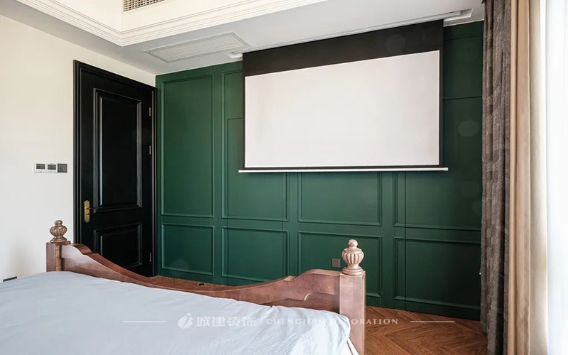 次臥以寧靜幽深的橄欖綠作為背景色,給空間帶來自然風的清新,搭配胡桃色木質家具,傳遞出一絲絲古典的神秘浪漫與細膩的質感。