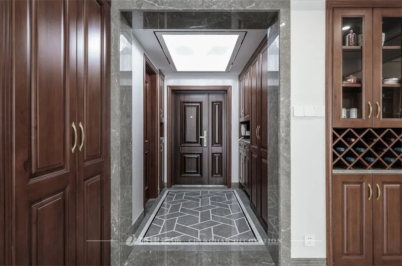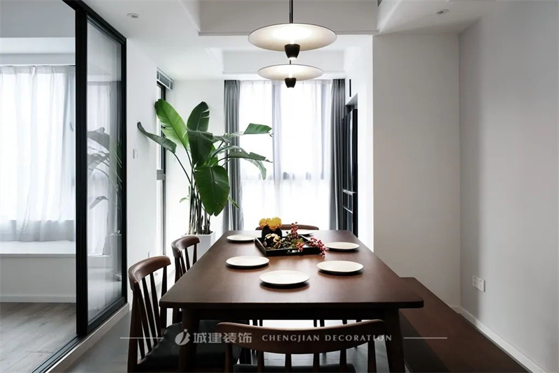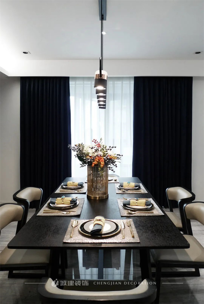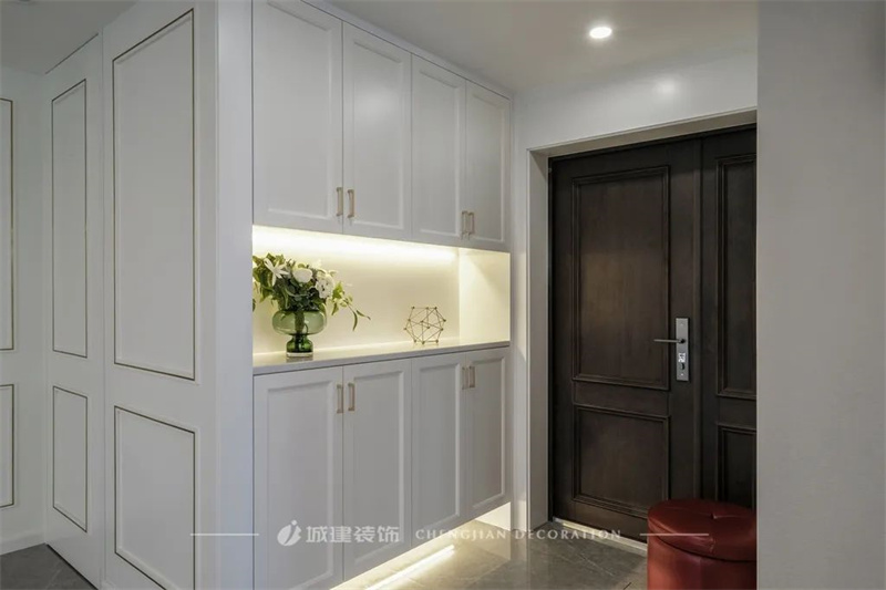 餐廳,無主燈設(shè)計(jì)很少,因?yàn)槭澄锸侵攸c(diǎn),所以餐桌上方的光源很重要,可以選擇吊燈裝在餐桌上方作為主要照明,重點(diǎn)打亮餐桌,讓食物看起來更美味可口。但是餐邊柜上方或餐桌周圍吊頂上可以安裝筒燈作為輔助光源,補(bǔ)足角落的光亮。餐邊柜放置水壺、杯子的中空層也可以安排暗藏?zé)魩А?/p>