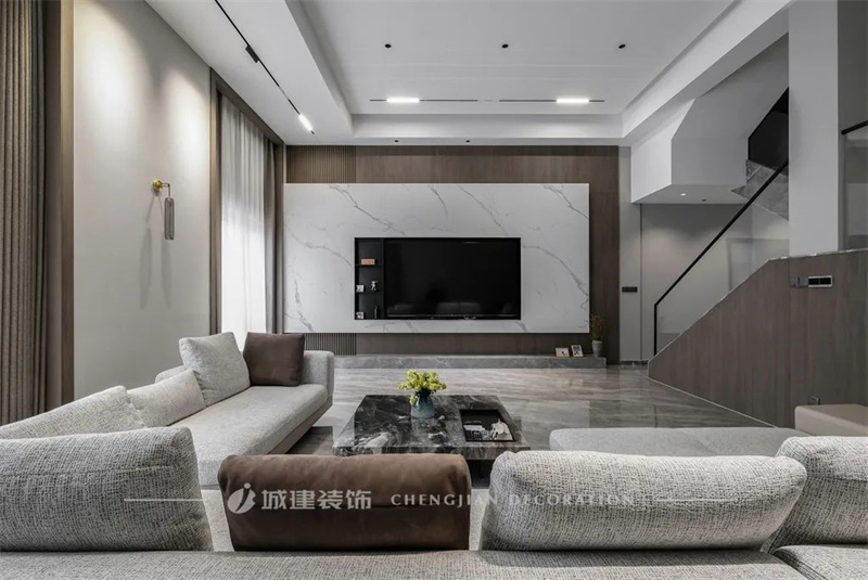 客廳通常是家中面積較大的空間,也是家人待在一起最長時間的地方,所以作為家的“C位”,其空間照明非常重要。無主燈設(shè)計(jì)的客廳,可以利用筒燈、軌道燈、線燈等多點(diǎn)分布均勻照亮整體空間,也可以在沙發(fā)邊放置落地?zé)?,電視墻、邊幾上方等個別的地方則可以用射燈或線性吊燈做重點(diǎn)照明,射燈的優(yōu)點(diǎn)是方便調(diào)整角度,指哪兒亮哪兒,也是營造空間氛圍光源的利器