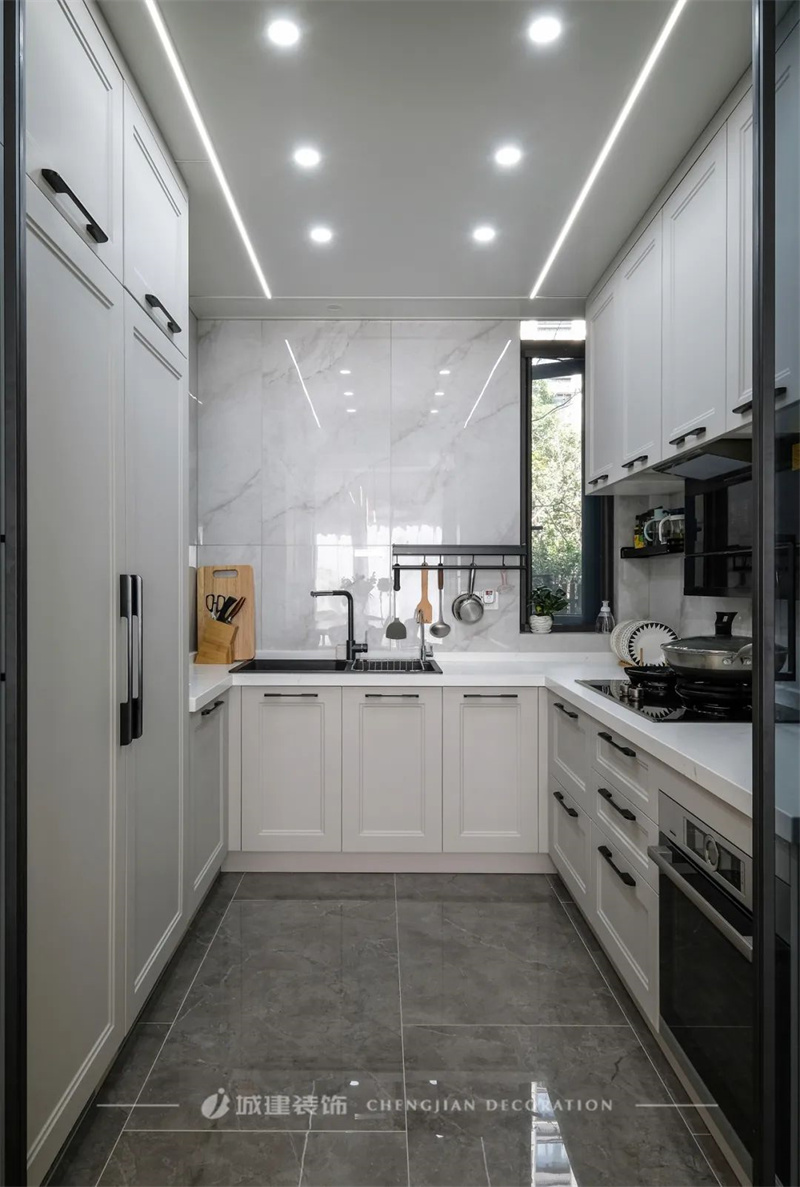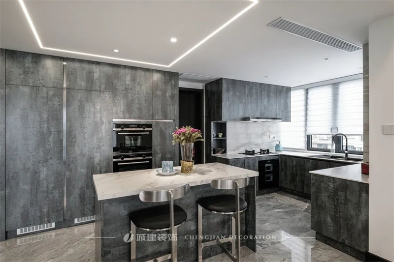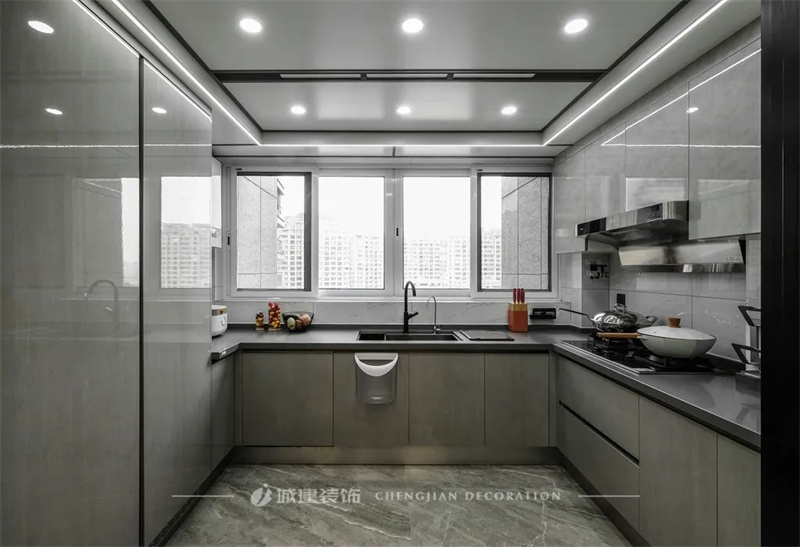 廚房的照明重點(diǎn)是實(shí)用性,可以線燈、筒燈、磁吸式軌道燈等多種組合,避免陰暗死角。尤其是水槽、備料區(qū)上方和油煙機(jī)下方要添加光源,保證在廚房操作的時候有充足的光線。