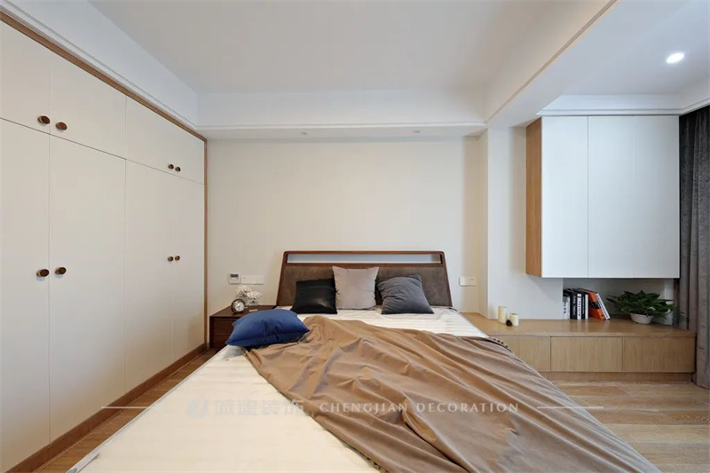 一體化的地臺床設(shè)計讓臥室看起來更寬敞,也更具整體性,它將床頭柜與床,甚至背景墻融為一體,降低居室的重心,將空間利用極致,帶給居住者滿滿的安全感。