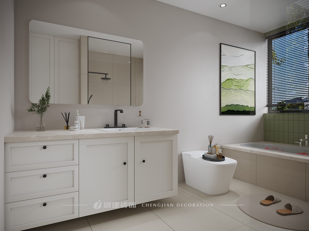 衛(wèi)生間以草綠色的小磚點(diǎn)綴
