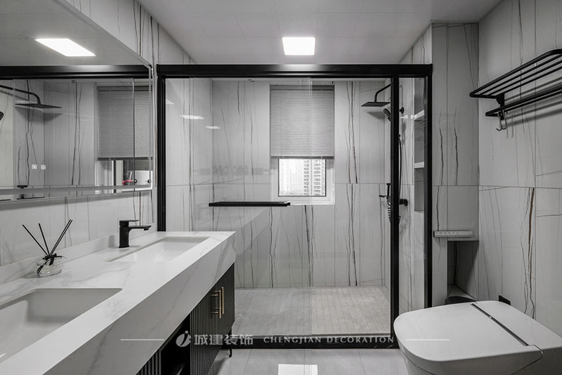 衛(wèi)生間以經(jīng)典的黑白搭配。雙臺盆設(shè)計、超大智能浴室鏡,讓洗漱成為享受;