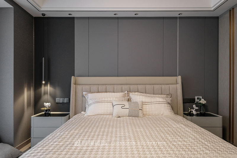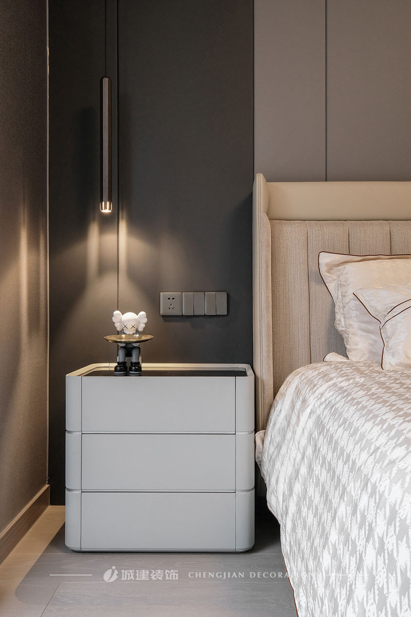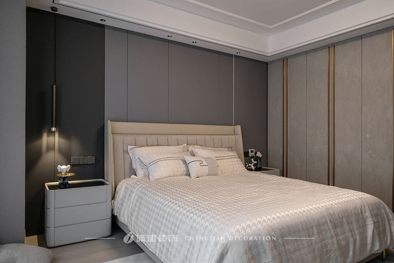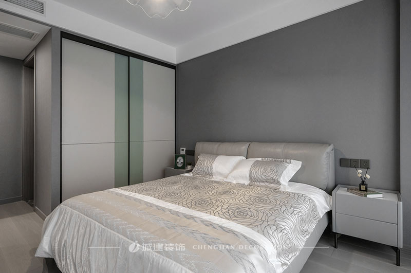 主臥,從墻面到衣柜,是灰色的深淺漸變,空間視覺更有層次;