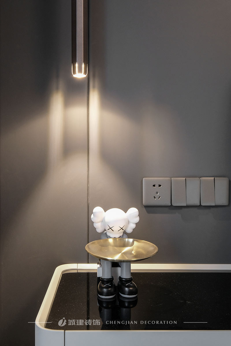 空間整體以灰色為基調(diào),灰色的墻布、灰色的硬包、泛著柔潤光澤的木飾面...