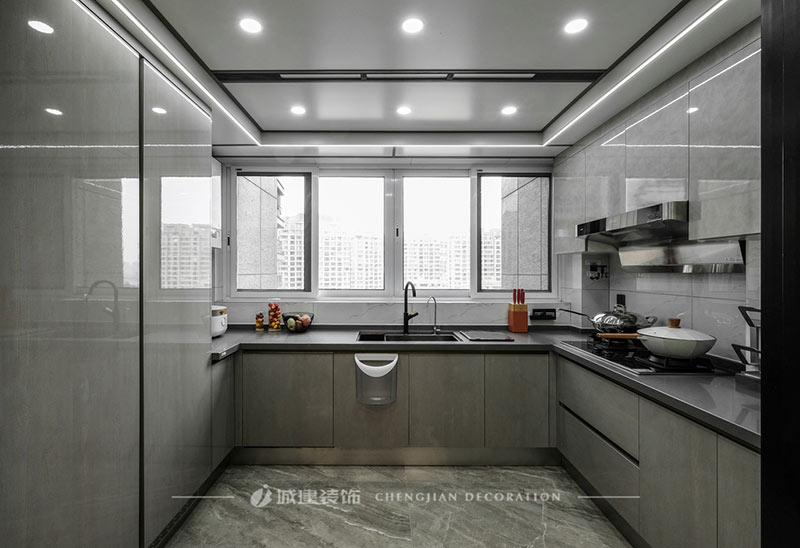 u字形廚柜,滿足了日常烹飪操作空間,亮面的灰色,雅致有格調(diào),嵌入式冰箱讓空間更統(tǒng)一。