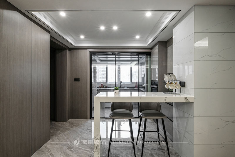 開放式西廚區(qū),白色臺面吧臺與白色墻磚既是空間之間的區(qū)隔過渡,也是與客餐廳元素的相互呼應(yīng),讓整體空間更有層次更和諧。