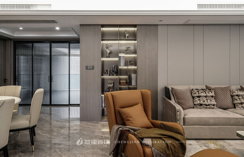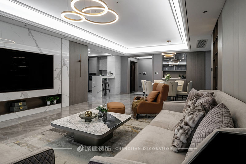 克制而平和的氛圍空間里,亮面石材與金屬等元素的相映,讓低調(diào)的輕奢質(zhì)感不經(jīng)意流淌,傳遞出溫暖有品質(zhì)的生活氣息。
