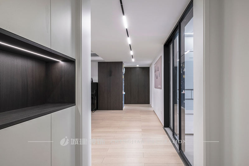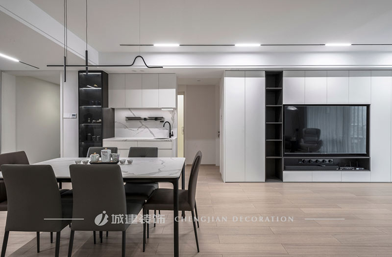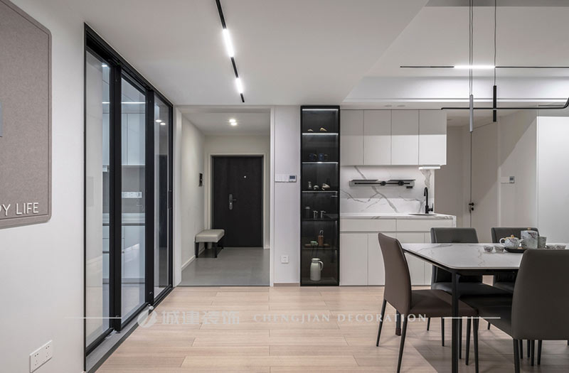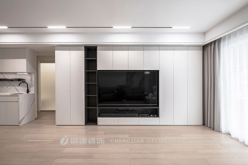 無把手白色啞光柜門讓空間更簡約純粹,中間穿插黑色展示柜,豐富層次,更有質感。