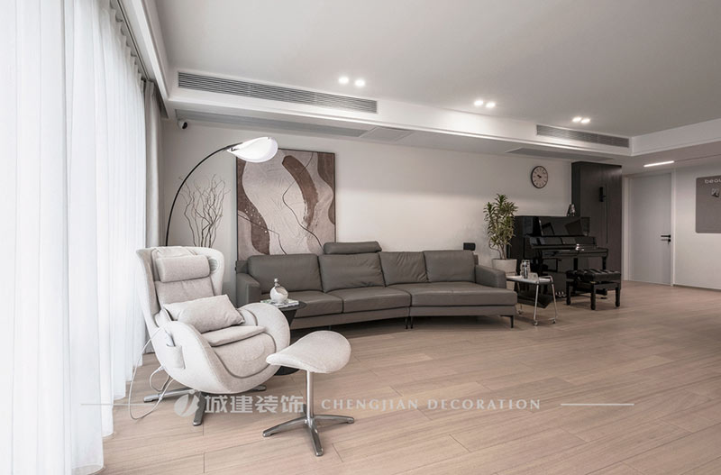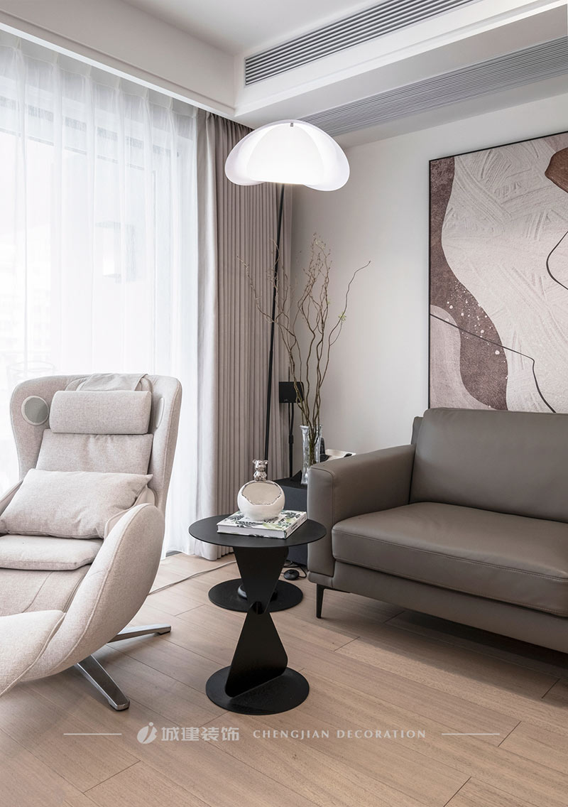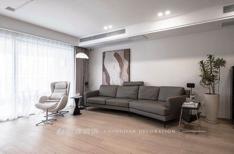 極簡風格首選無主燈設計,本案客廳選擇筒燈、嵌入式軌道燈搭配,不同光源帶來不同的光線效果。