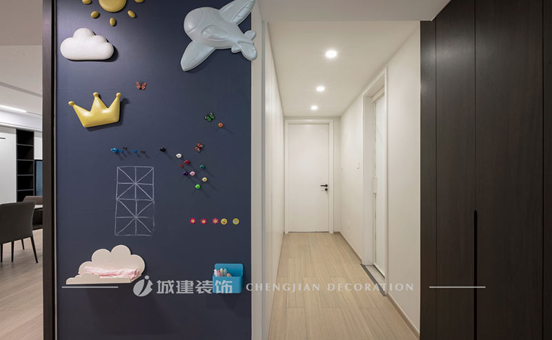 另一側做成黑板墻,讓孩子們自由創(chuàng)作,為空間增添童趣。