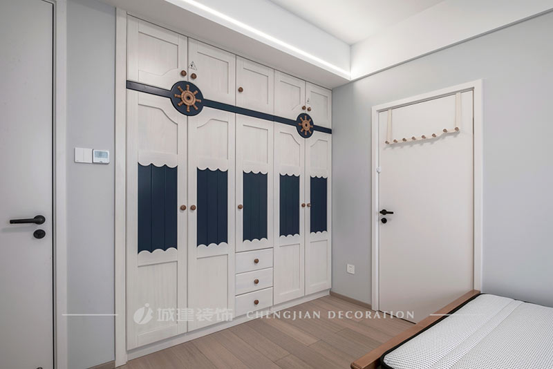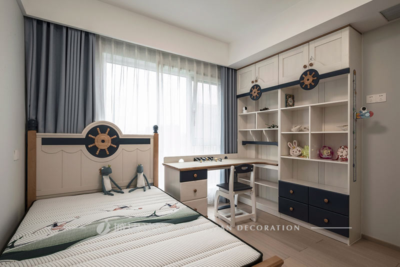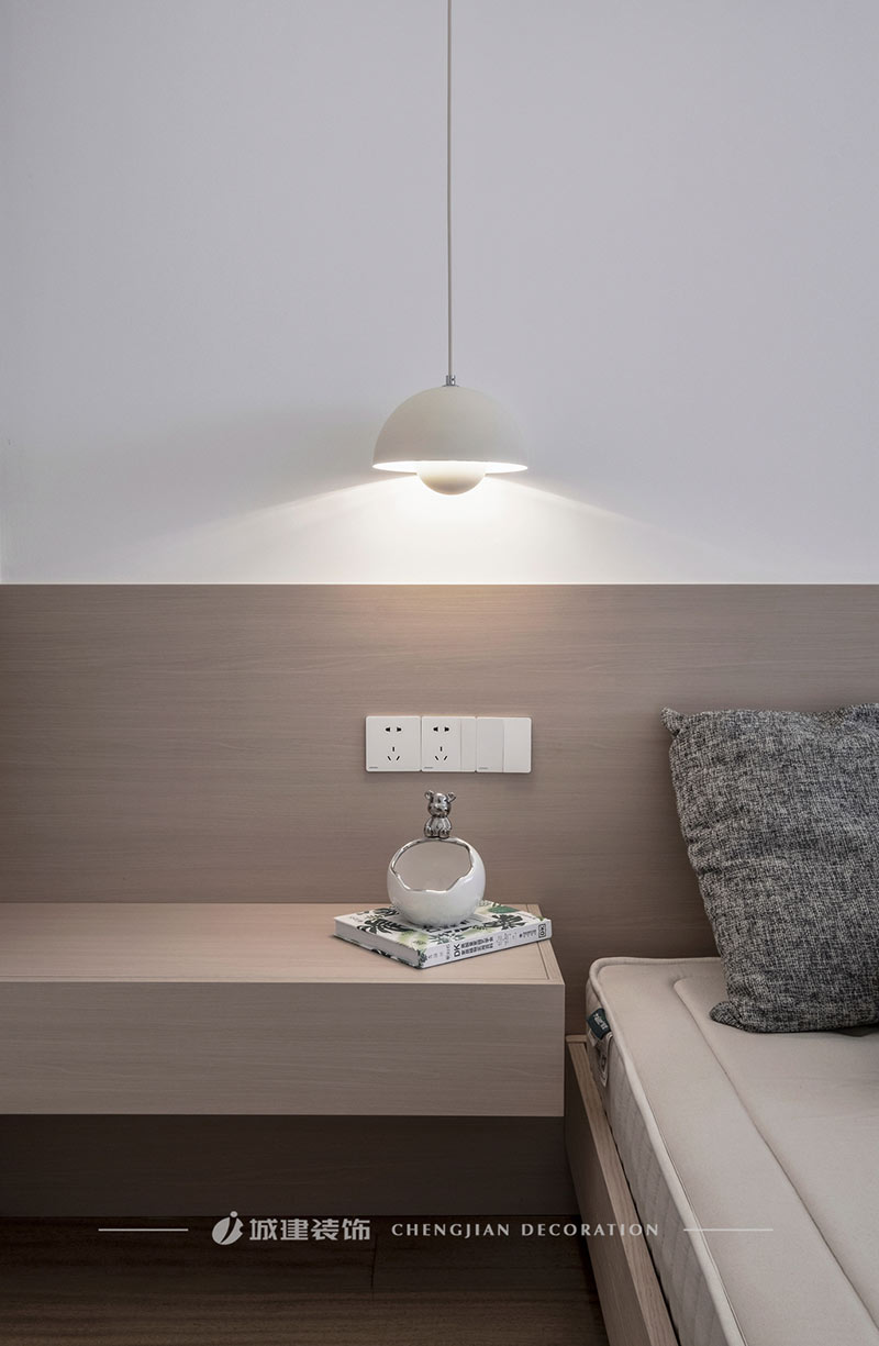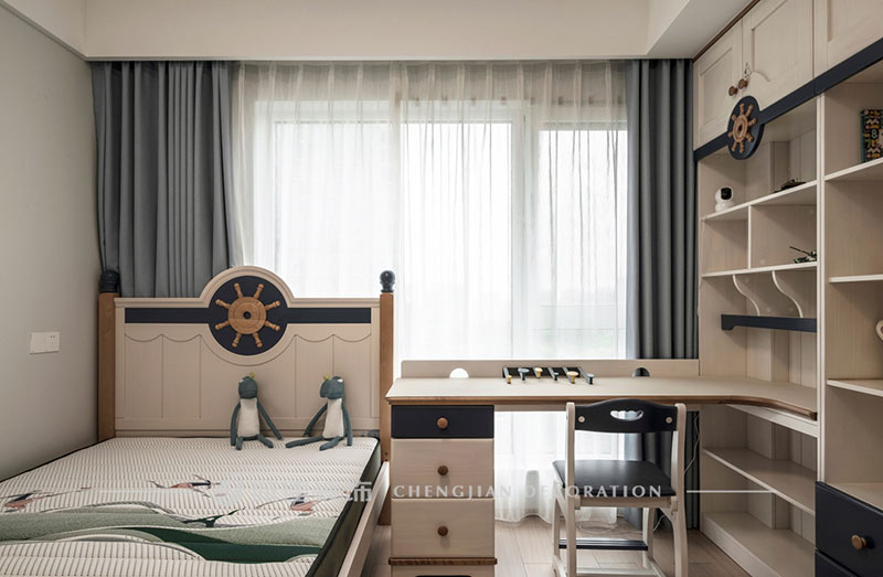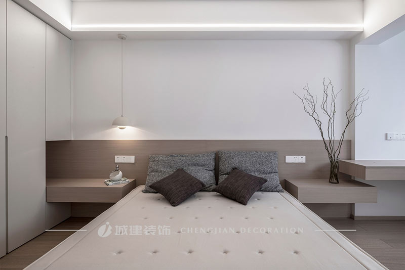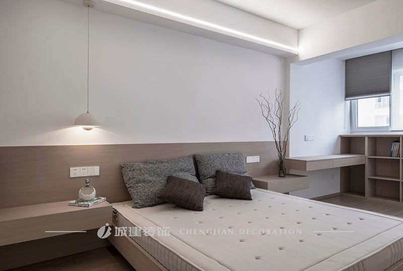 床、床頭柜、衣柜與書桌書柜的一體化定制設計,充分利用了每一寸空間,讓整個臥室看起來更具設計感和整體感;
