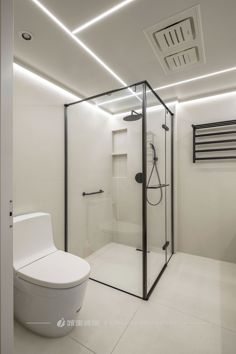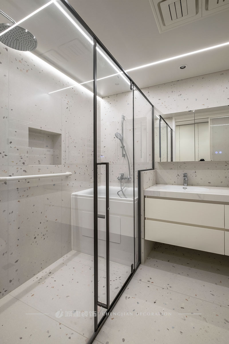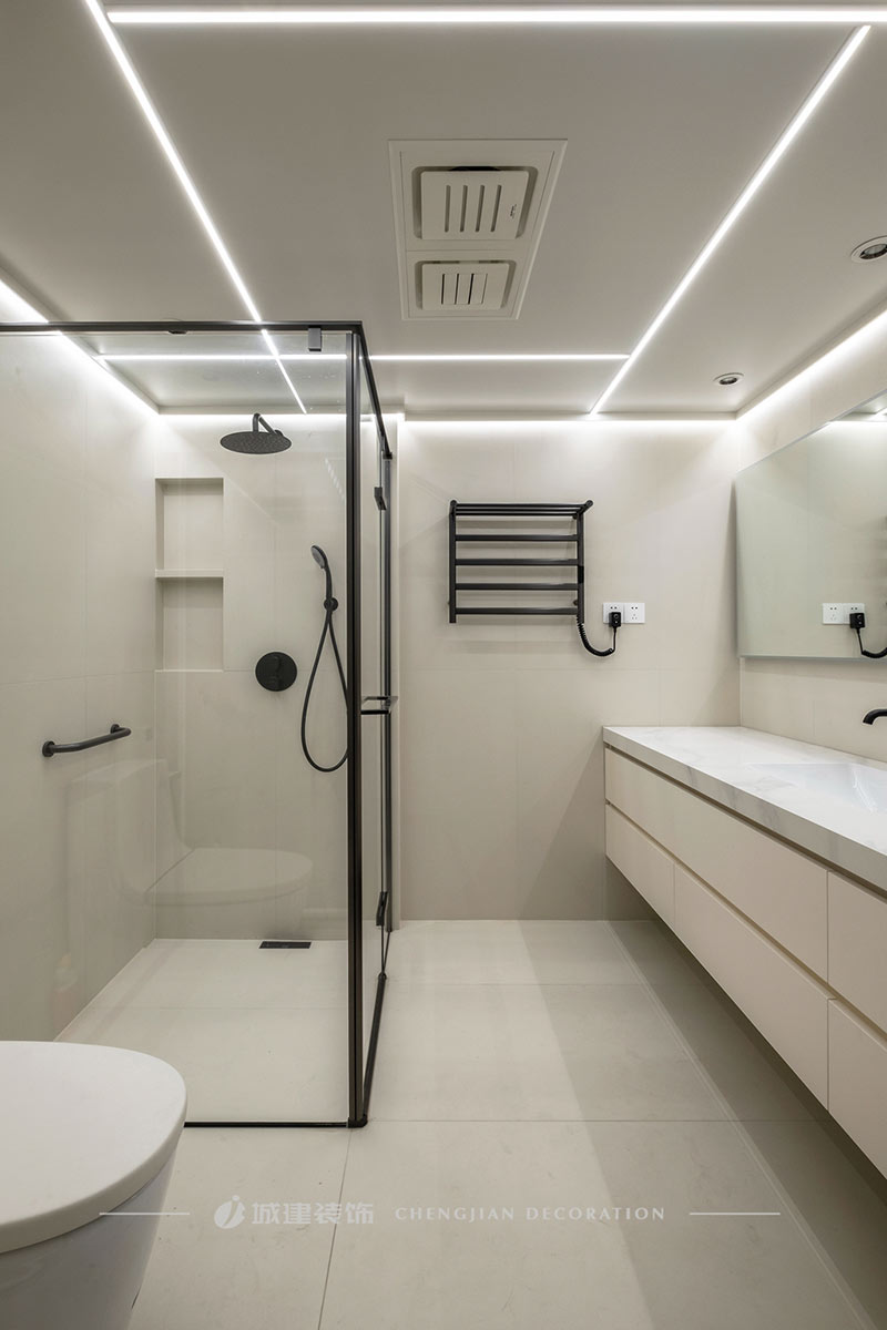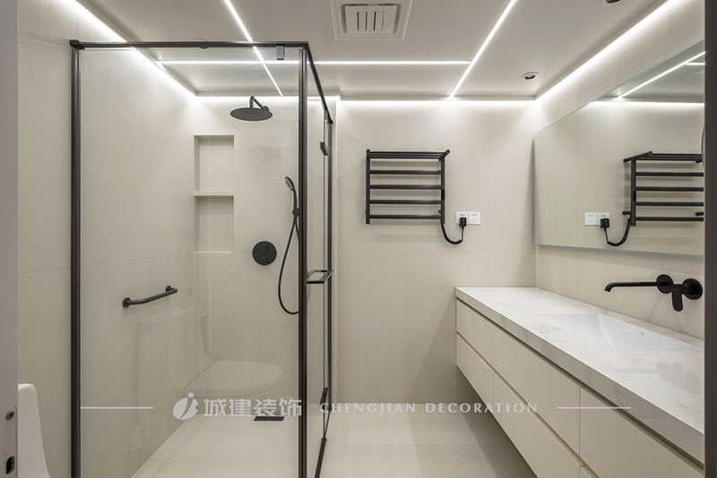 搭配黑色極窄邊框淋浴房、花灑等衛(wèi)浴元素,平淡的色彩,卻散發(fā)著無限雋永的高級美感。