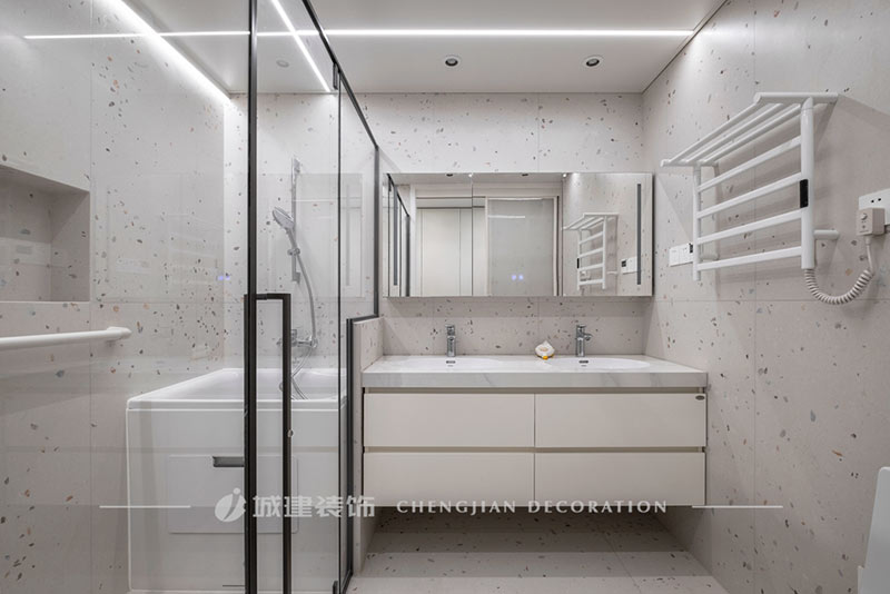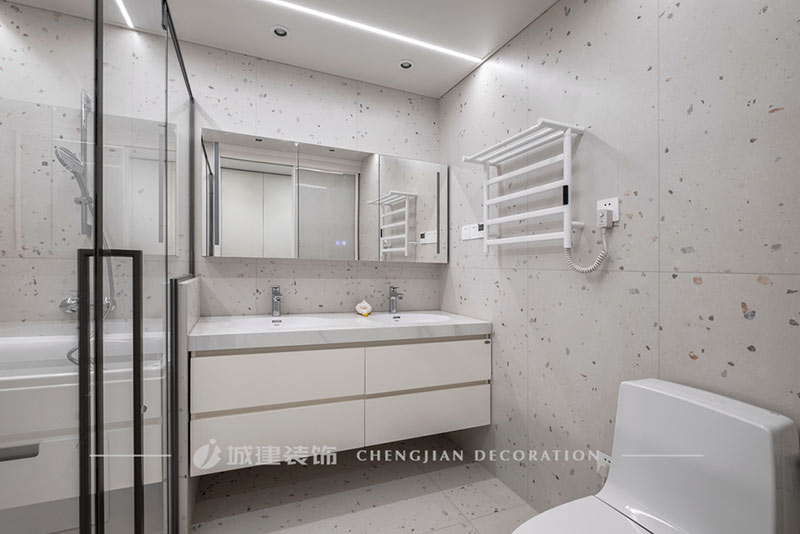 不同于客衛(wèi)侘寂風的高級感,孩子的衛(wèi)生間選擇了淺灰色水磨石墻地磚,上面各色碎石圖案的隨意排列,讓空間更顯清新活力。