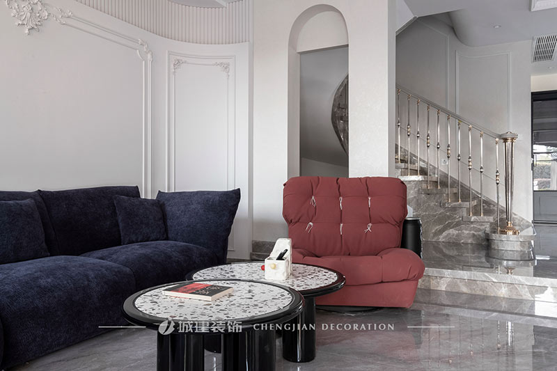 客廳以大面積淺色營造輕盈的空間,以紅藍(lán)色沙發(fā)點綴,層次豐富有格調(diào);
