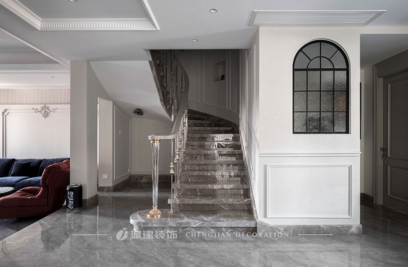 旋轉(zhuǎn)樓梯,大理石+亞克力水晶扶手,當(dāng)燈帶亮起,古典與時尚的碰撞,璀璨無比。