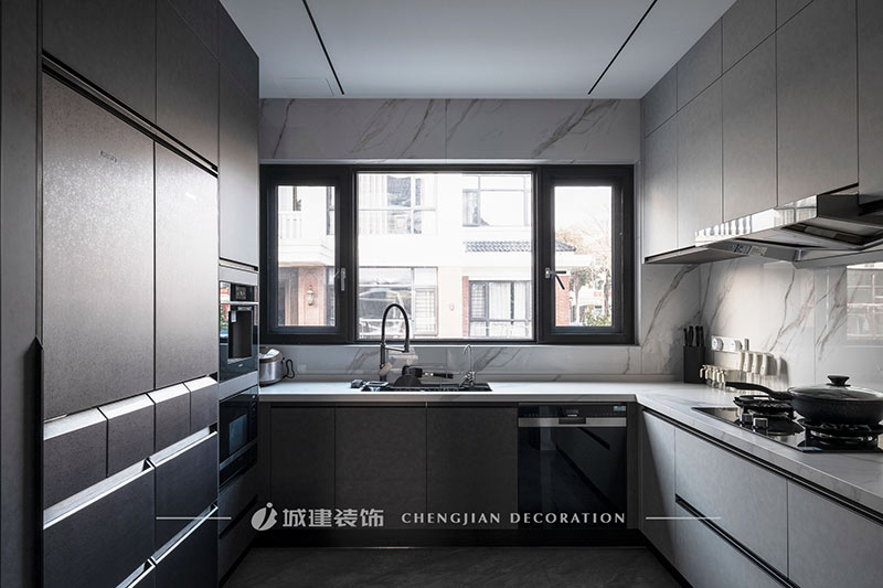 而三聯(lián)動玻璃移門讓光線徜徉屋內(nèi),廚房布局寬敞干凈。