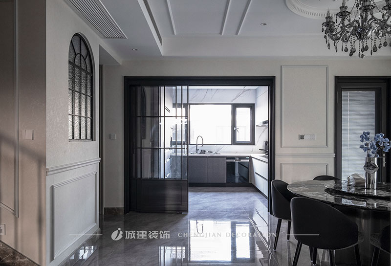 墻上設(shè)計的一扇拱形黑框?水紋玻璃造型的小窗,與復(fù)古樣式的廚房移門相得益彰,營造法式中古的精致浪漫。