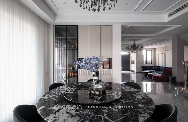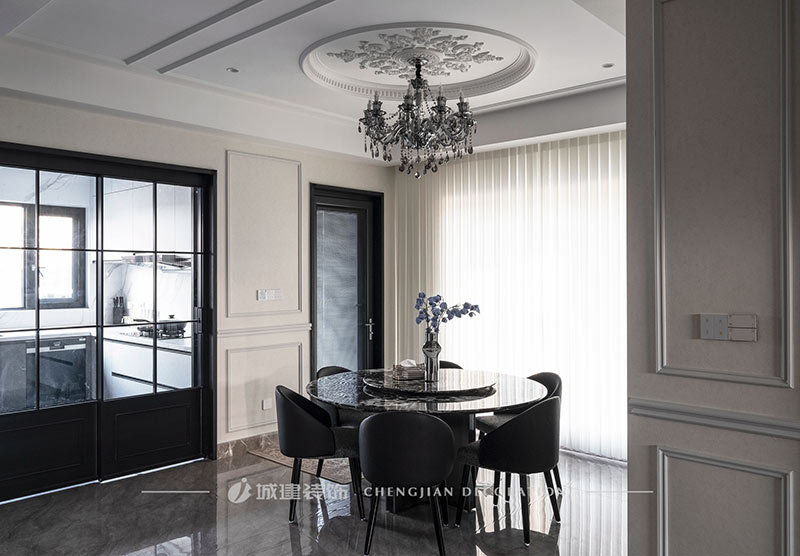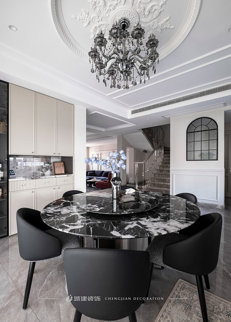 餐廳黑色大理石圓餐桌,搭配華麗的黑色水晶吊燈以及雕花吊頂,突顯奢華高雅的空間氣質(zhì)。