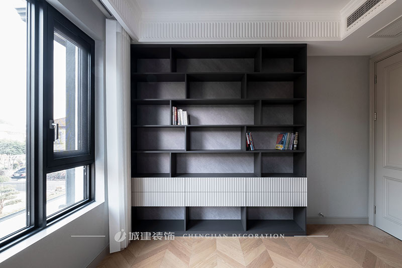 書房依墻定制書桌、書柜,深灰色+白色的配色,簡潔時尚