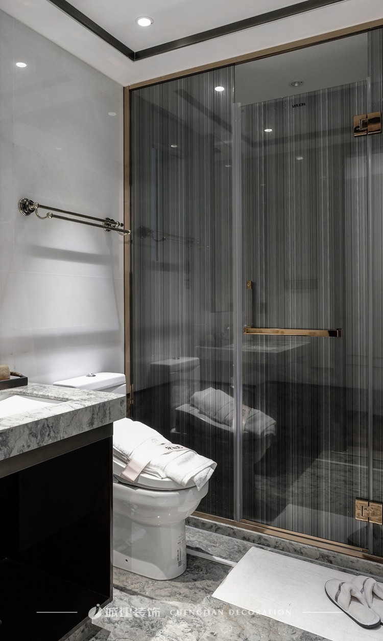 衛(wèi)生間時尚輕奢。雕刻的浴缸在燈光的照射下如同一件精美的瓷器。